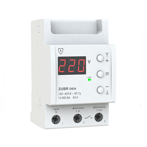 Однофазне реле напруги ZUBR D63t відключає навантаження за критичної ситуації. Вибір верхньої межі напруги від 220 до 280 В, нижньої – від 120 до 210 В.