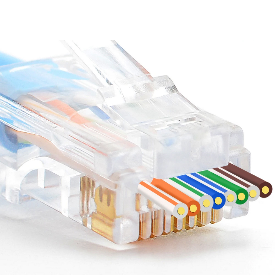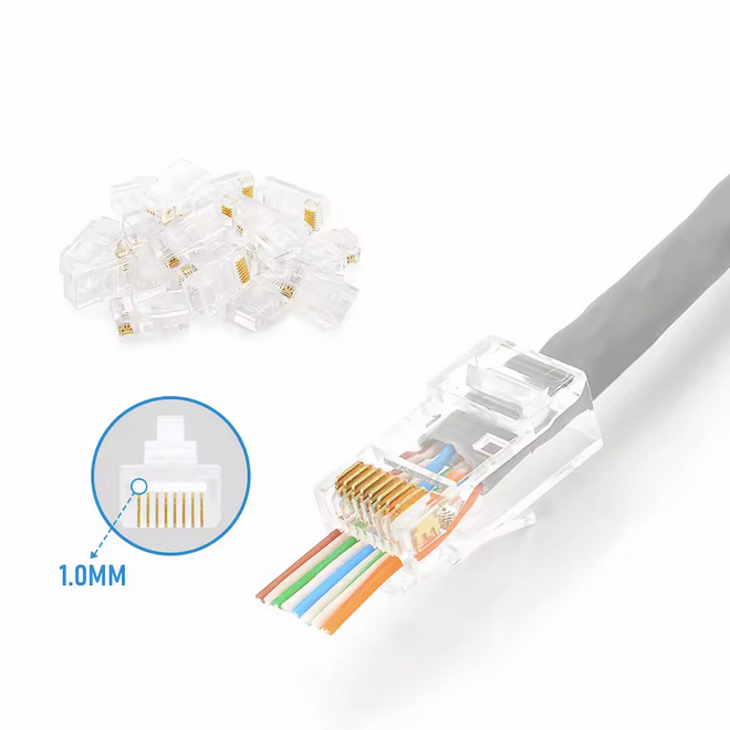 Конектор RJ45 з наскрізними отворами, кат. 5e призначений для 4-парного кабелю витої пари, підходить для одножильних та багатожильних провідників, з максимальним діаметром ізоляції провідника 1 мм.